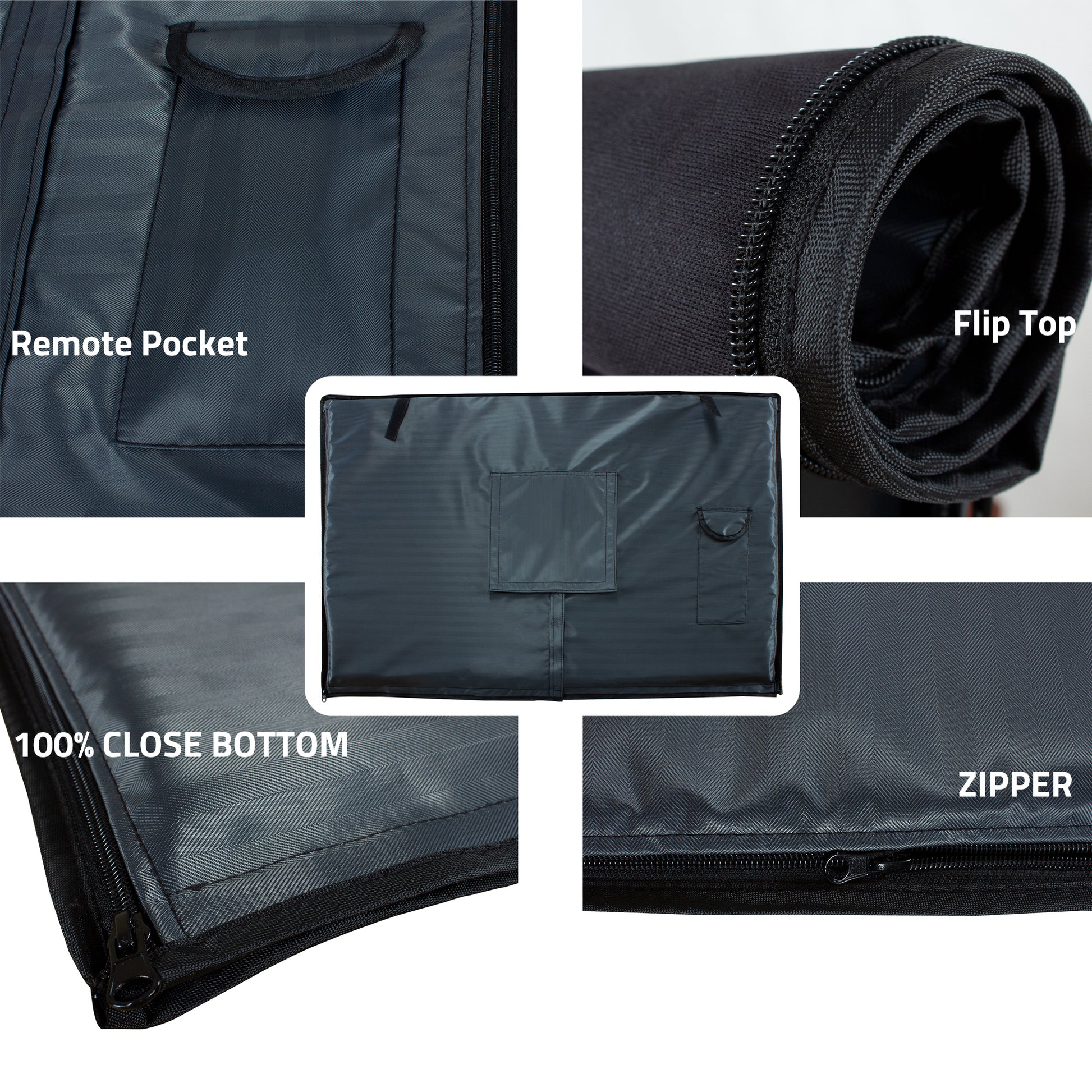 Remote control pocket in the back, side zippers, velcro bottom