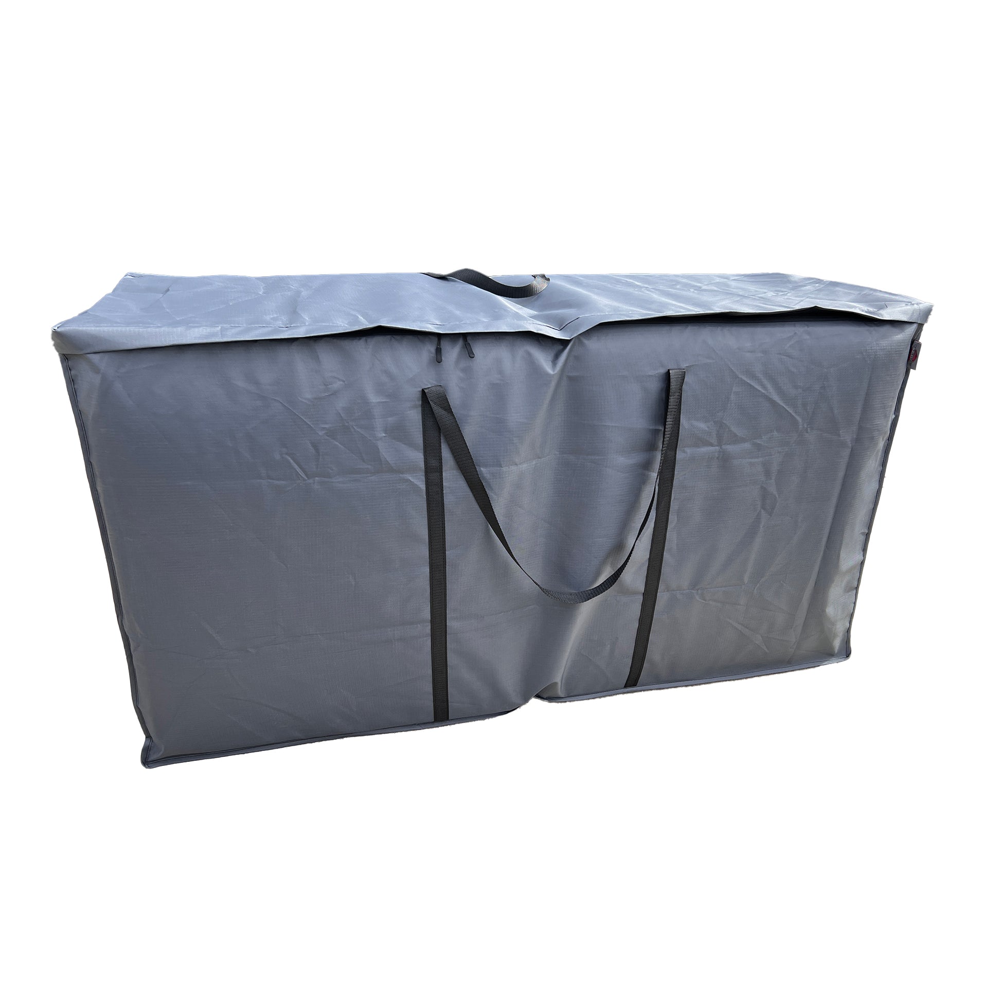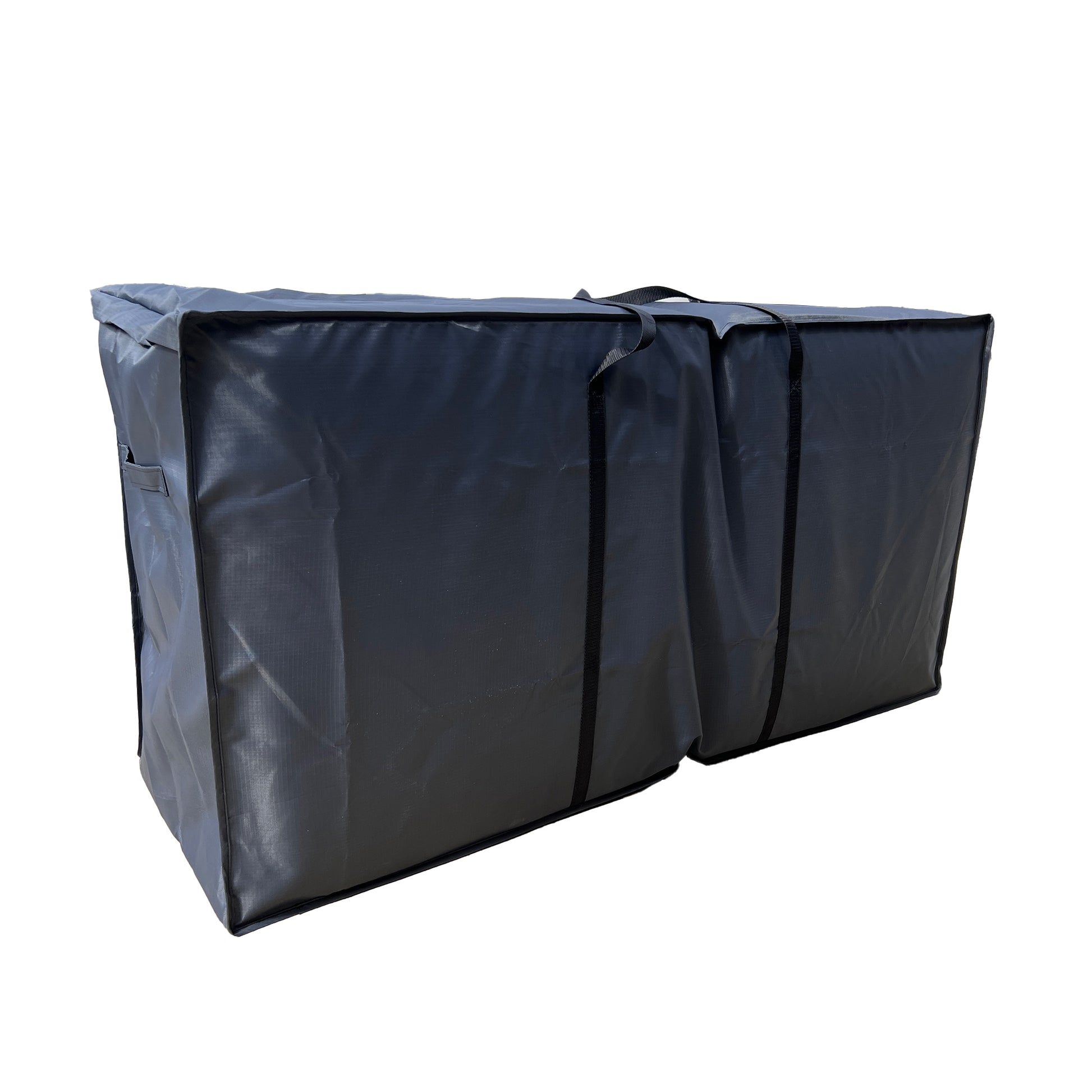 Sofa cushion bag can accommodate up to six standard sofa cushions, each not exceeding the dimensions of 26 inches in length, 26 inches in depth, and 6 inches in height. The cushions are organized inside the bag in two vertical rows, with three cushions per row.
